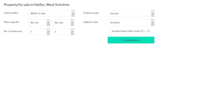 The areas we require this data for are all in Halifax, West Yorkshire. Searches should be filtered to the number of bedrooms specified, the property type set to "House" and the search area set to "This area plus 1/2 mile". There is a screen shot attached showing the required search criteria for 2 bedroom houses in Southowram.